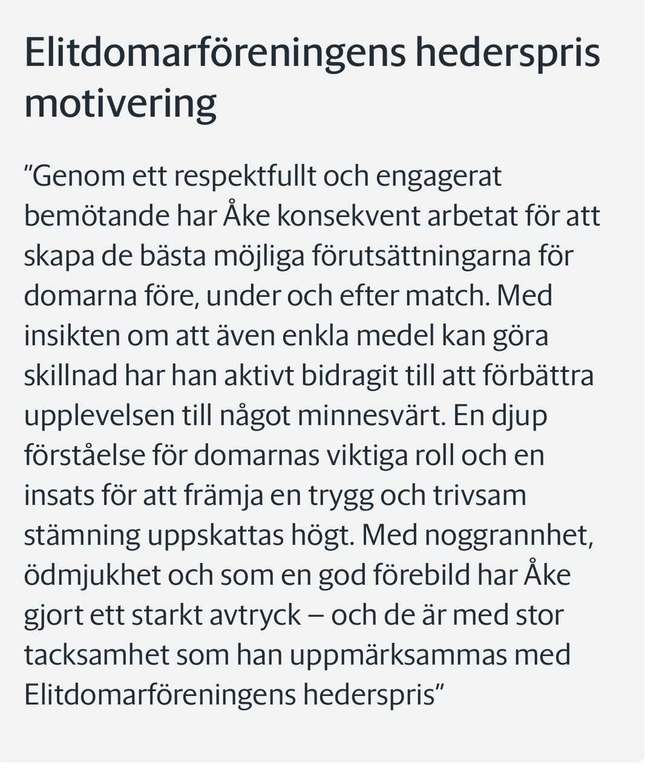 Elitdomarföreningen var enad om att Åke skulle tilldelas priset. I dagens HN kan ni läsa finns hela artikeln (låst för prenumeranter) tyvärr. Åke kommer även att hyllas i samband med kvalmatchen den 14 april.